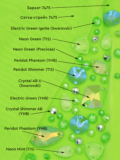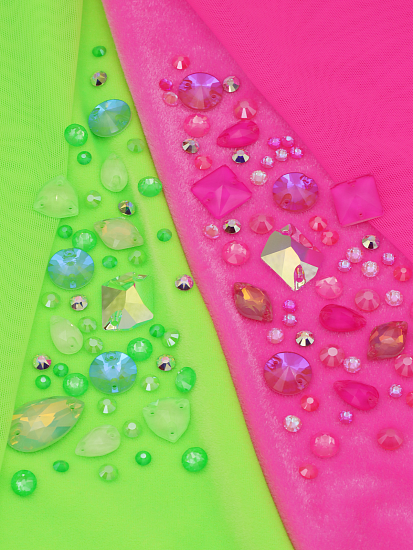 А компанию им составили стразы Swarovski, Stellux, Preciosa, YHB и TIS. Кристаллы в этих цветах наиболее удачно сочетаются с выбранными тканями.