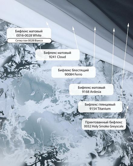 - матовая ткань с принтом, в цветовой гамме преимущественно серых оттенков с эффектом градации или дымчатости. Цвет представляет собой сочетание белого, светло-серого и насыщенного темно-серого с мягкими переходами между ними, создавая визуальный эффект дымки или тумана...