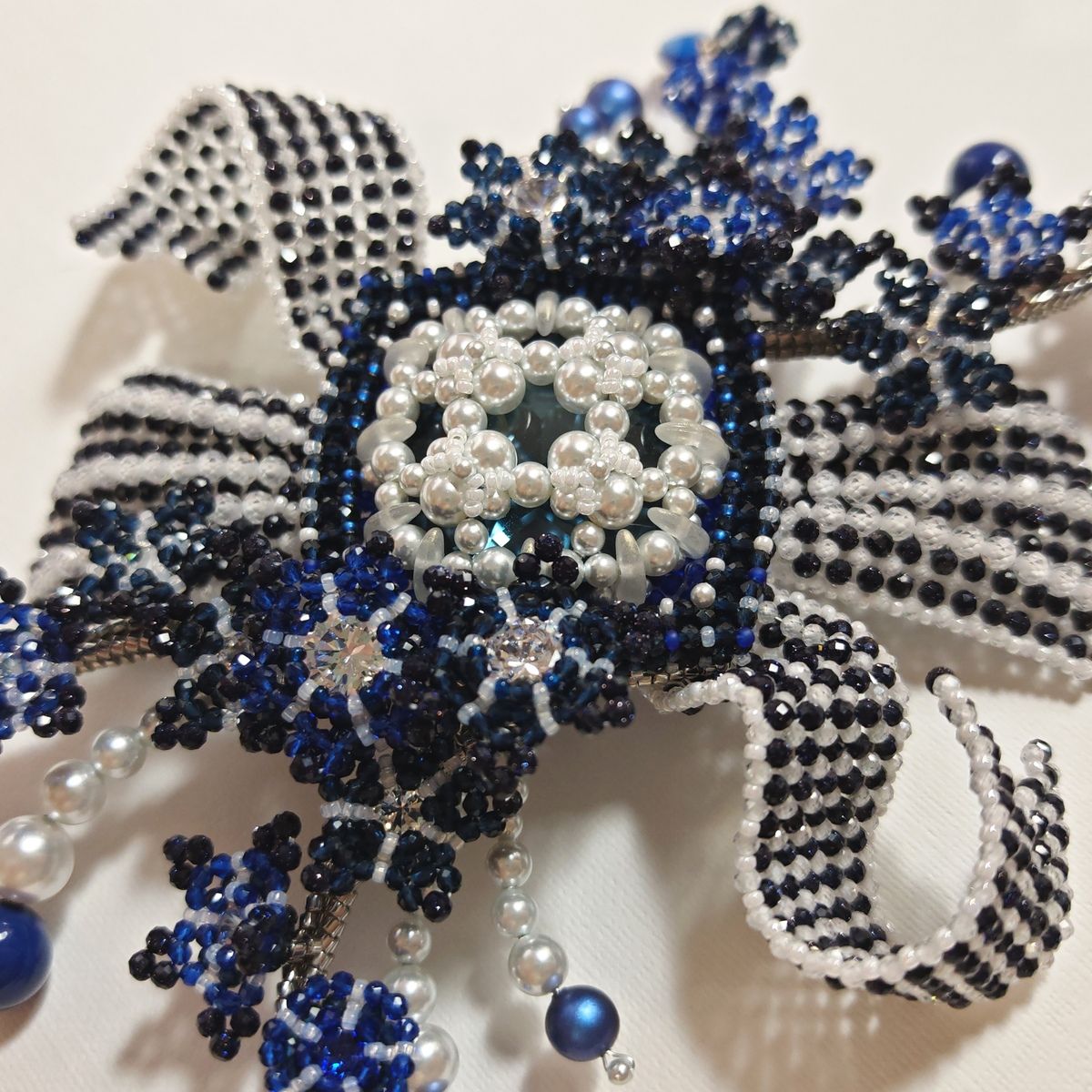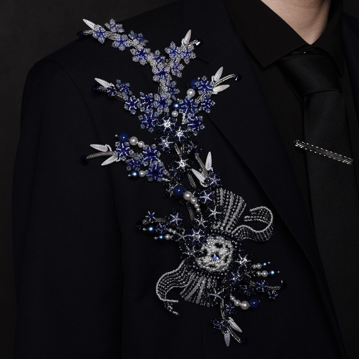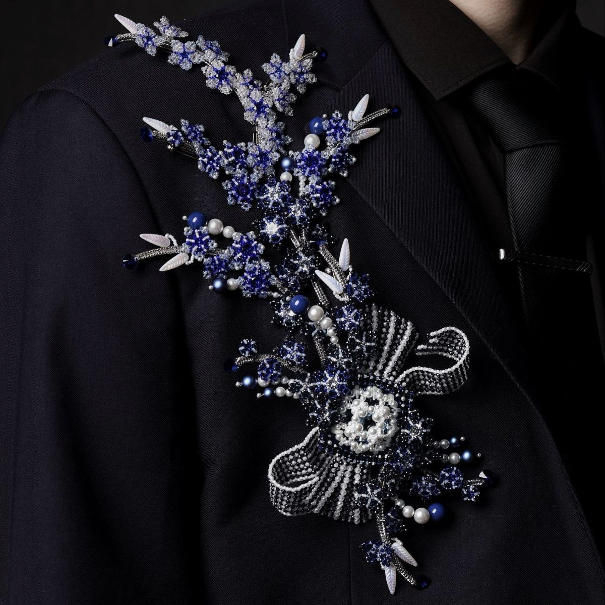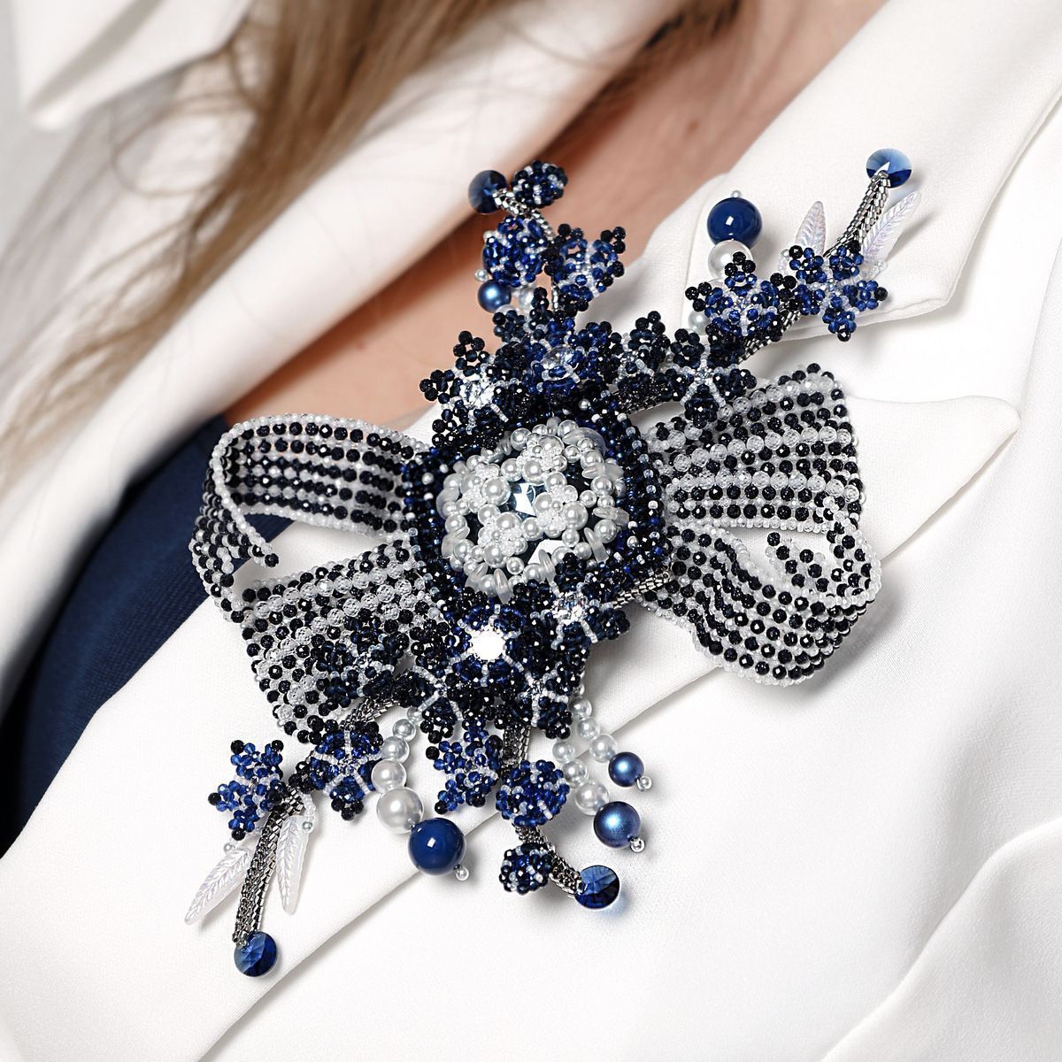 В её сердце — ажурный элемент с бантом и лентами, созданный из мельчайших бусин циркона и сумеречного стекла. Это архитектурный центр всей композиции. Он напоминает нам о классической строгости образа и о творческой свободе художника. Это узел, связующий все мотивы воедино.