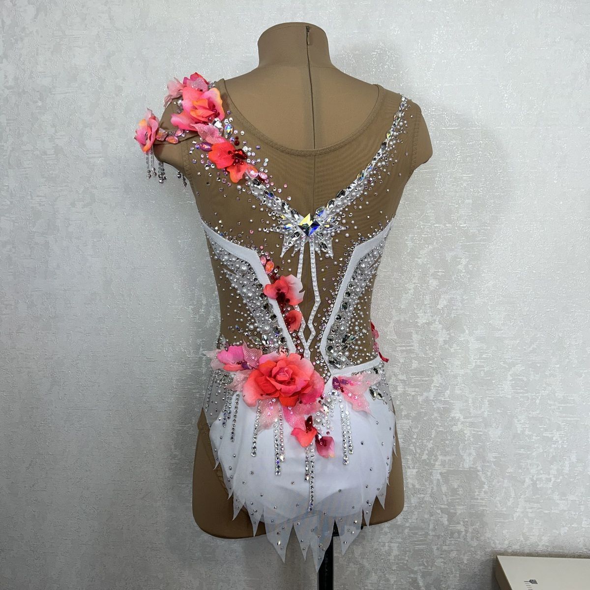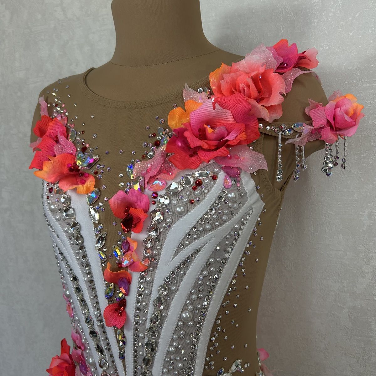 Цветы на плече и бёдрах подчёркивают линии тела. Образ завершают жемчуг, кристаллы нежных розовых и алых оттенков и подвески из страз передающие атмосферу «Венского бала».