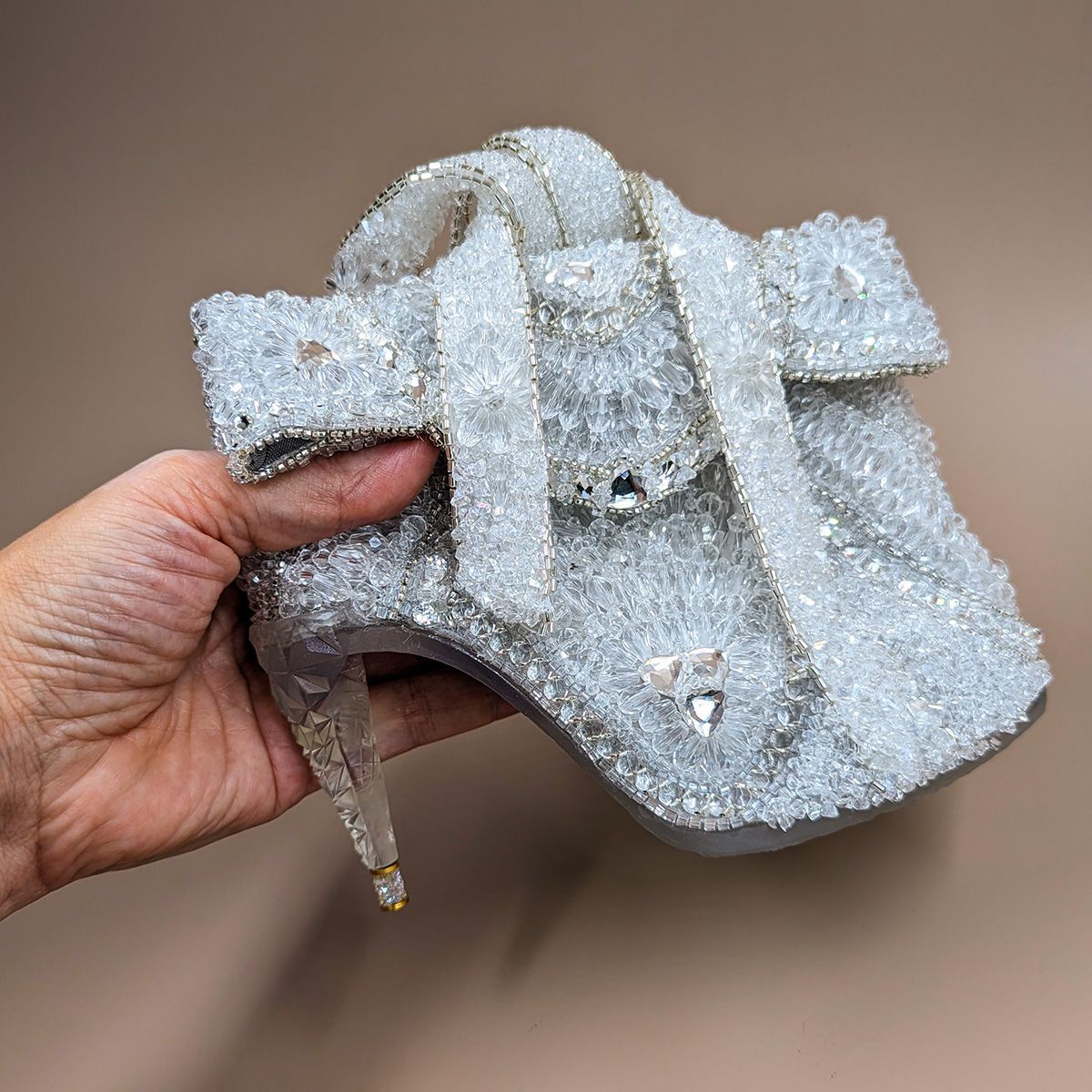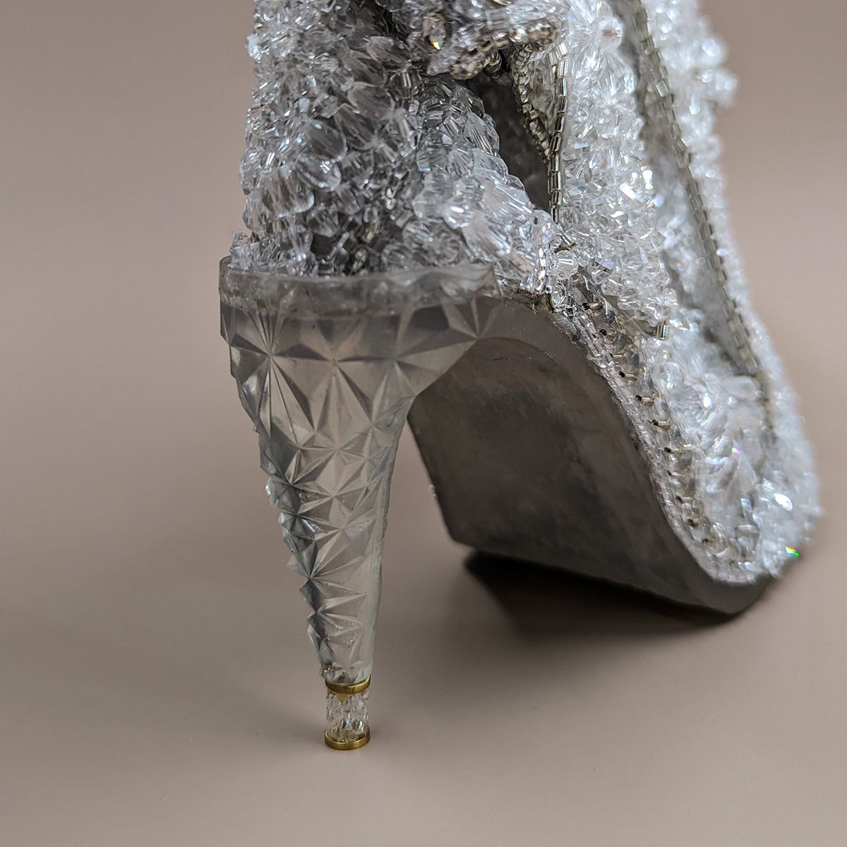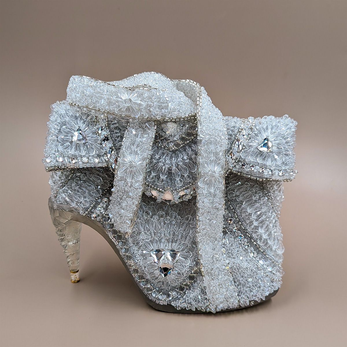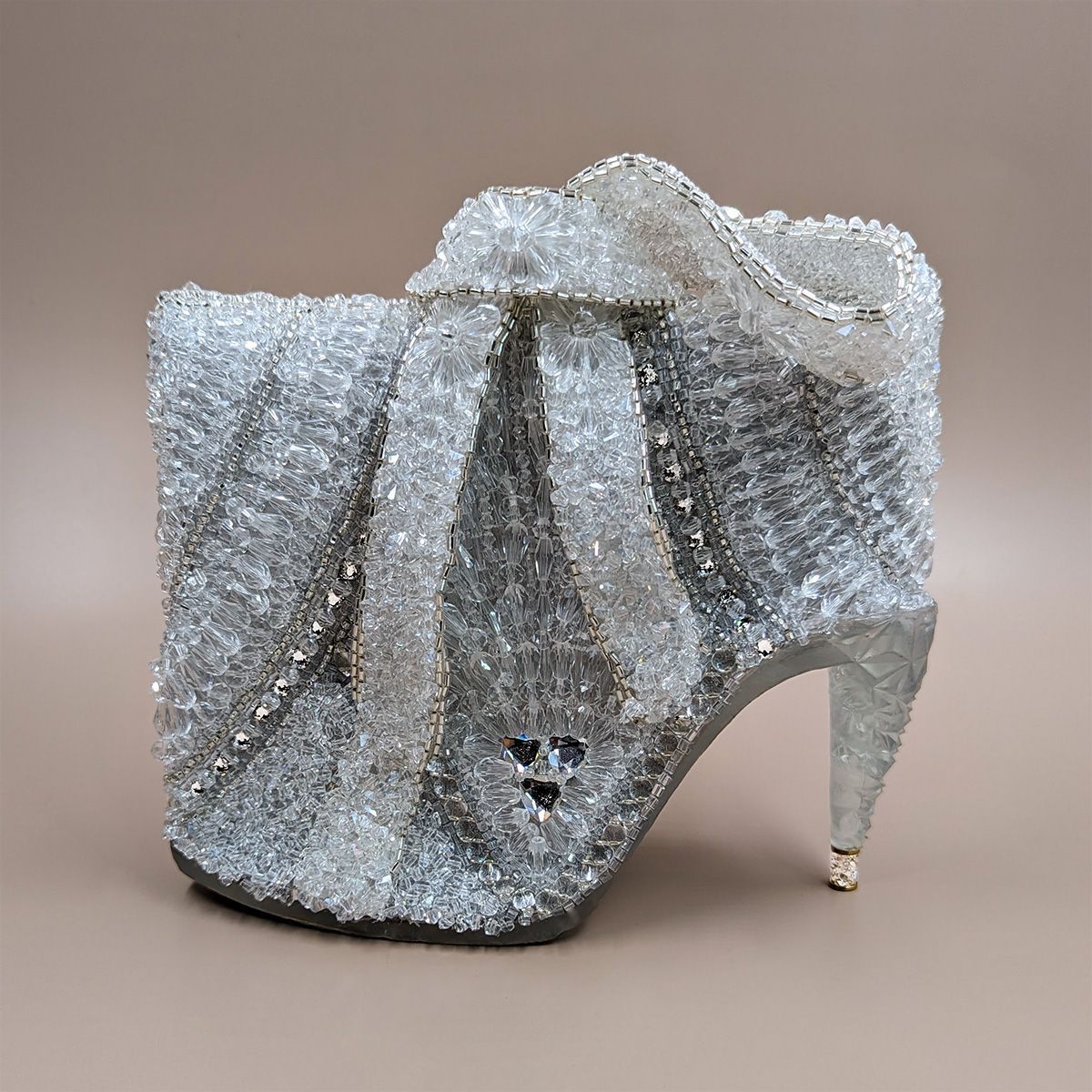 Сумочка «Хрустальный мираж» воплощает этот миг — когда мечта становится реальностью. Она объединяет образ потерянной туфельки Золушки и блеск венских залов. Её форма Венский бал: искусство вне эпох— игра иллюзий: то ли туфелька Золушки, то ли драгоценная скульптура, превращённая в изысканный аксессуар, каждый элемент которого напоминает о сиянии хрустальных люстр венских залов. Вышивка стеклянными бусинами и кристаллами в сочетании с элементами, созданными технологиями будущего, отражают свет множеством граней, как настоящий хрусталь, наполняют поверхность живым сиянием, превращая её в хрустальный мираж, где холодная прозрачность встречается с огненной искрой света.
