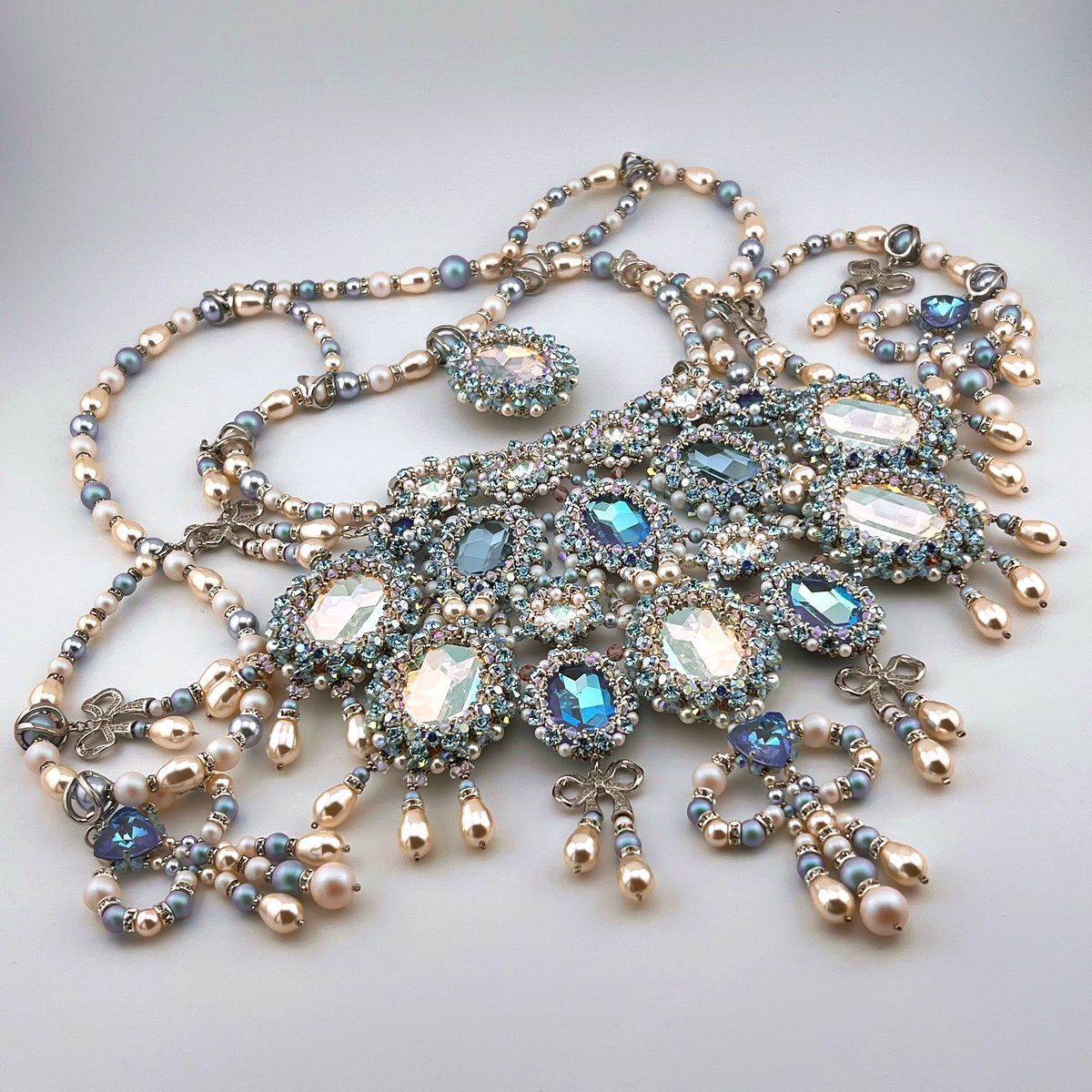 Колье - трансформер. Ведь не каждый день даже королеве необходимо блистать и быть в центре внимания! Украшение собрано из множества интересных деталей, которые позволяют колье не только подстраиваться под вырез платья, но и перевоплощаться из по-царски роскошного украшения в повседневное (кулон, сотуар, бусы, браслет…).